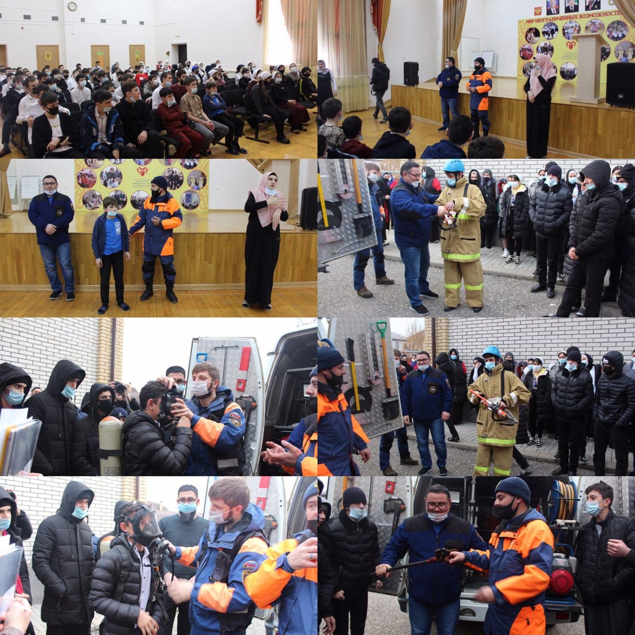 Затем из актового зала дети в сопровождении сотрудников МЧС вышли во двор школы-интерната, где стоял аварийно-спасательный автомобиль МЧС. Тут состоялась демонстрация спасательного оборудования и объяснение принципов работы с пожарным и спасательным инструментом. Особый интерес ребят вызвал ГАСИ (гидравлический аварийно-спасательный инструмент). Аварийно-спасательный автомобиль был оснащён всеми видами оборудования и инструментов на все случаи ЧС: в случае пожара, автокатастрофы, разрушения жилого здания.