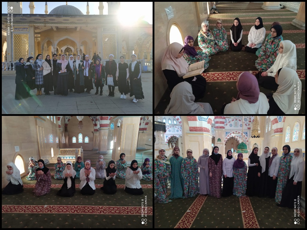 Все обучающиеся вместе с руководителем совершили в мечети коллективную молитву, прося милости и благоденствия Всевышнего для республики, народа, Главы республики и его семьи, своих родителей, учителей и родной школы. Также педагог Радуева М.Т. прочитала в мечети несколько сур из священного Корана.