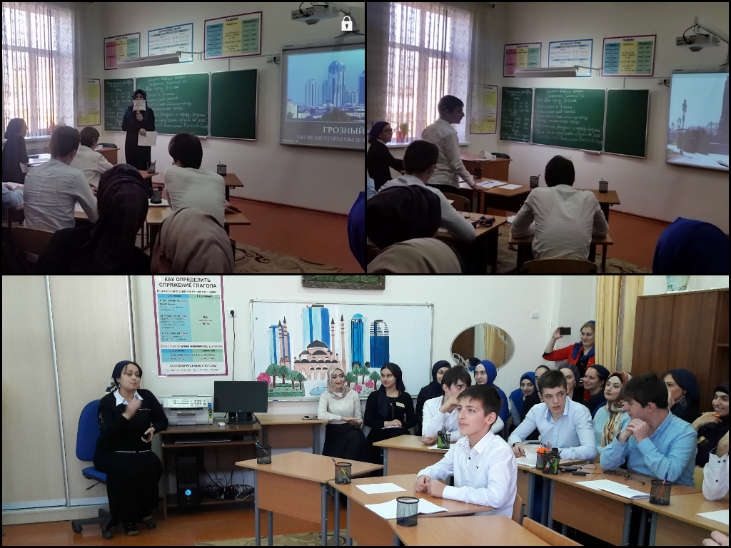Классный руководитель Татаева Кулсам Руслановна вместе с обучающимися провела заочную экскурсию по улицам и площадям столицы, демонстрируя красивые слайды. Обучающиеся рассказали об истории образования Грозного, об исторических памятниках, о главной достопримечательности - мечети имени Ахмат-Хаджи Кадырова «Сердце Чечни», которая является точной копией стамбульской «Софии».