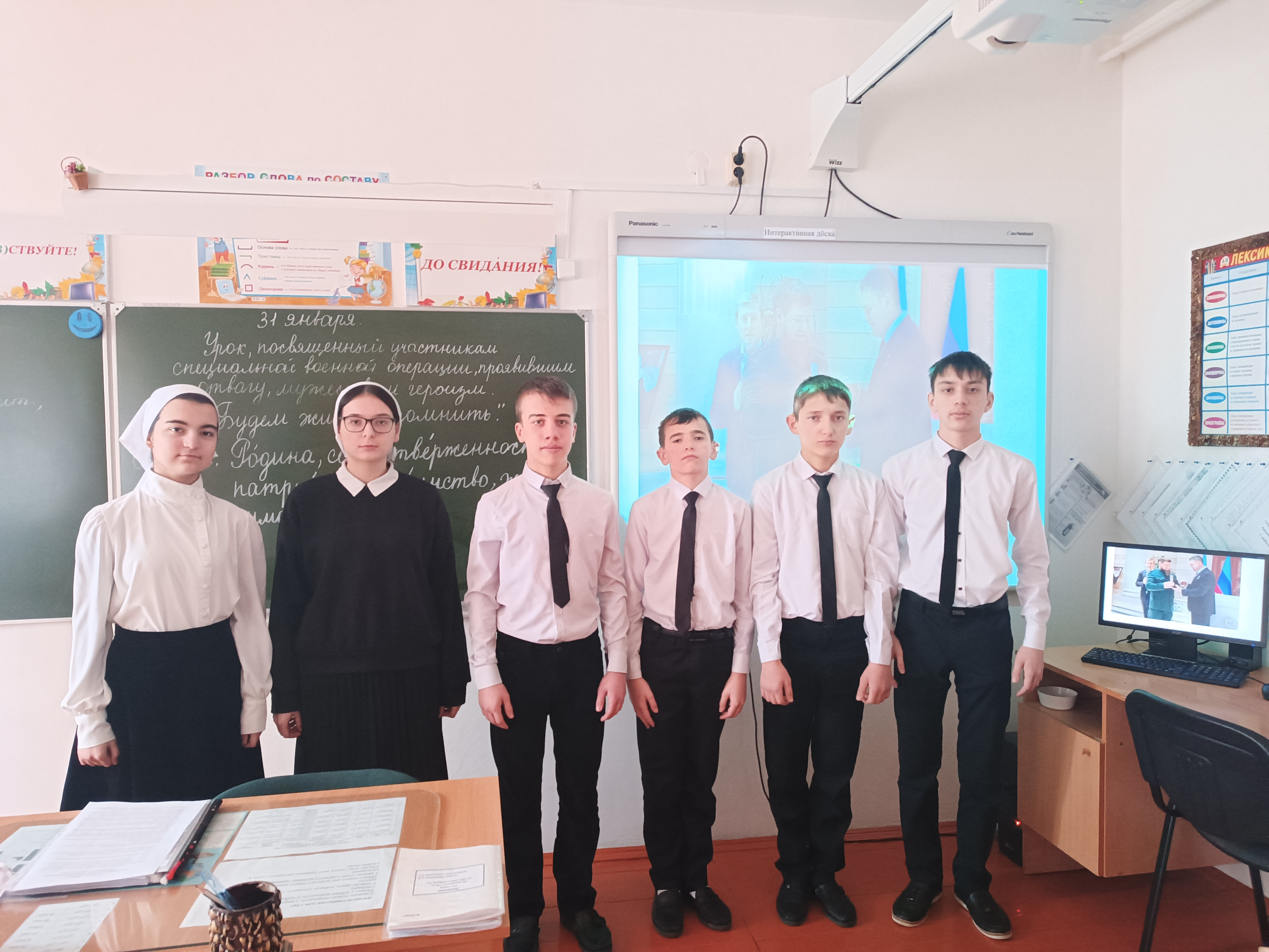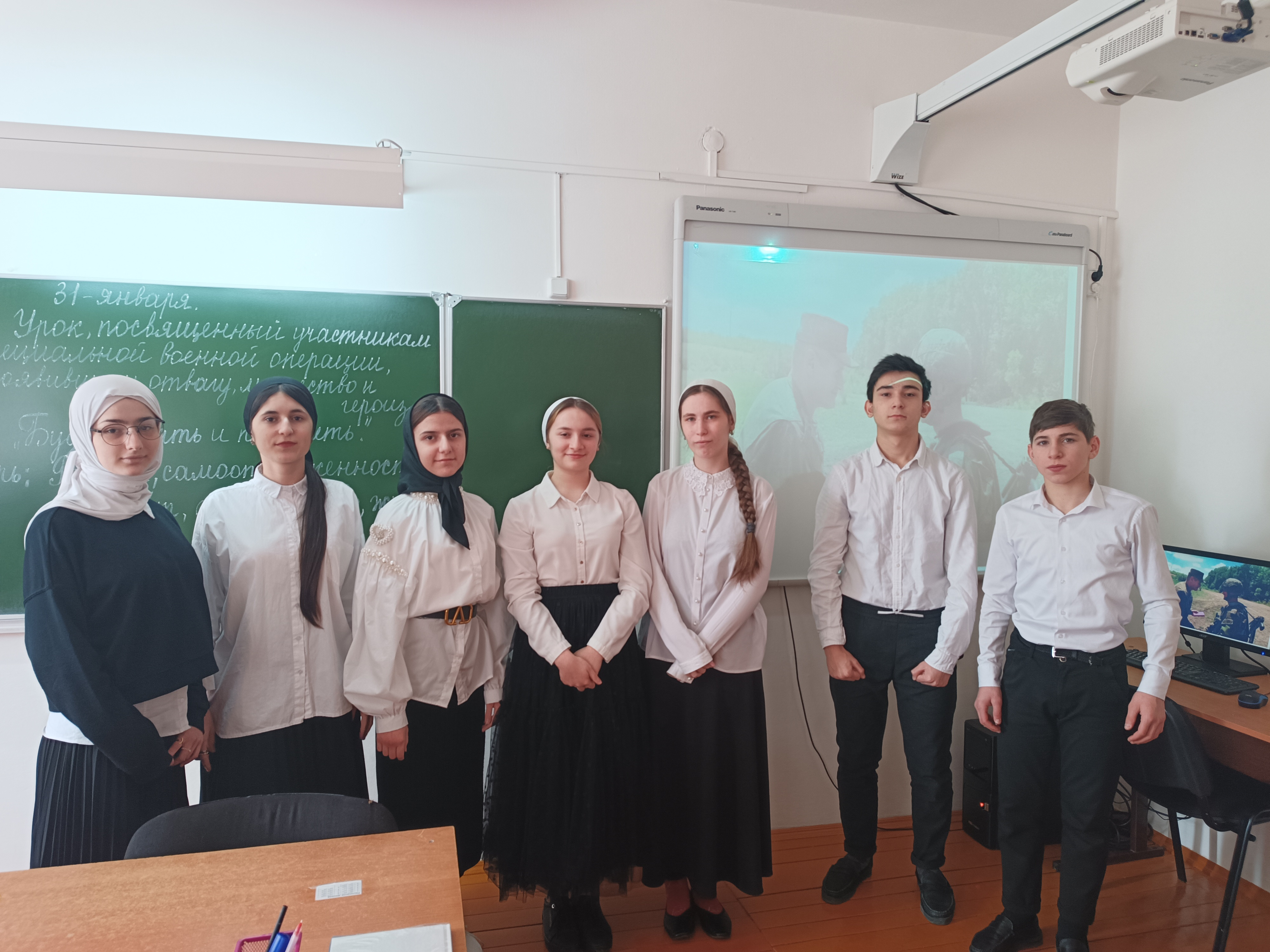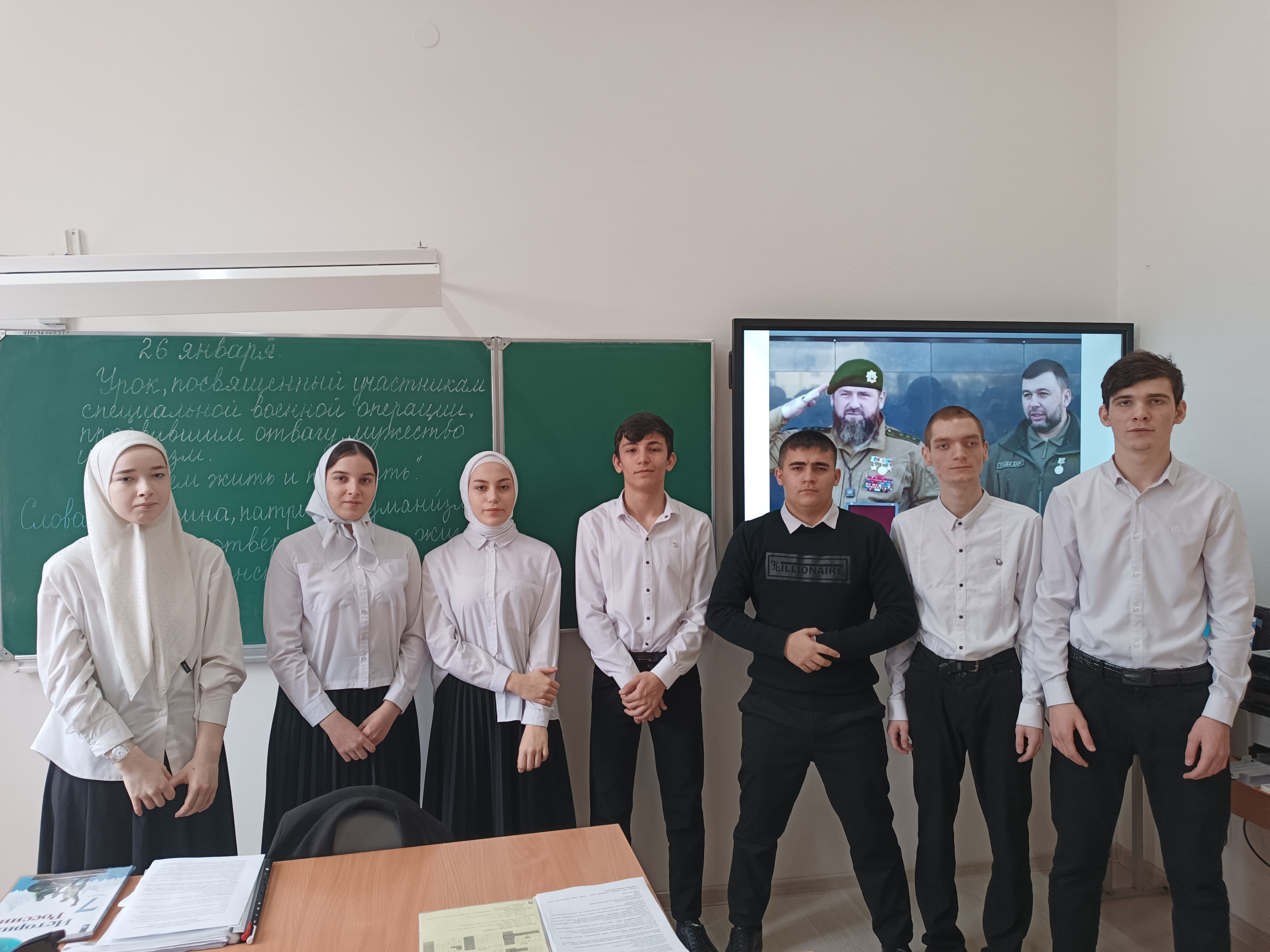 07.03.2023Во исполнение Перечня Поручений по итогам встречи Президента Российской Федерации с матерями военнослужащих – участников специальной военной операции 25 ноября 2022 года, на основании письма Министерства образования и науки Чеченской Республики № 37/07-44 от 11.01.2023 года, в ГБОУ «С(к)ОШИГС» для обучающихся 7-11 классов проведены уроки, посвящённые участникам специальной военной операции, проявившим отвагу, мужество и героизм.