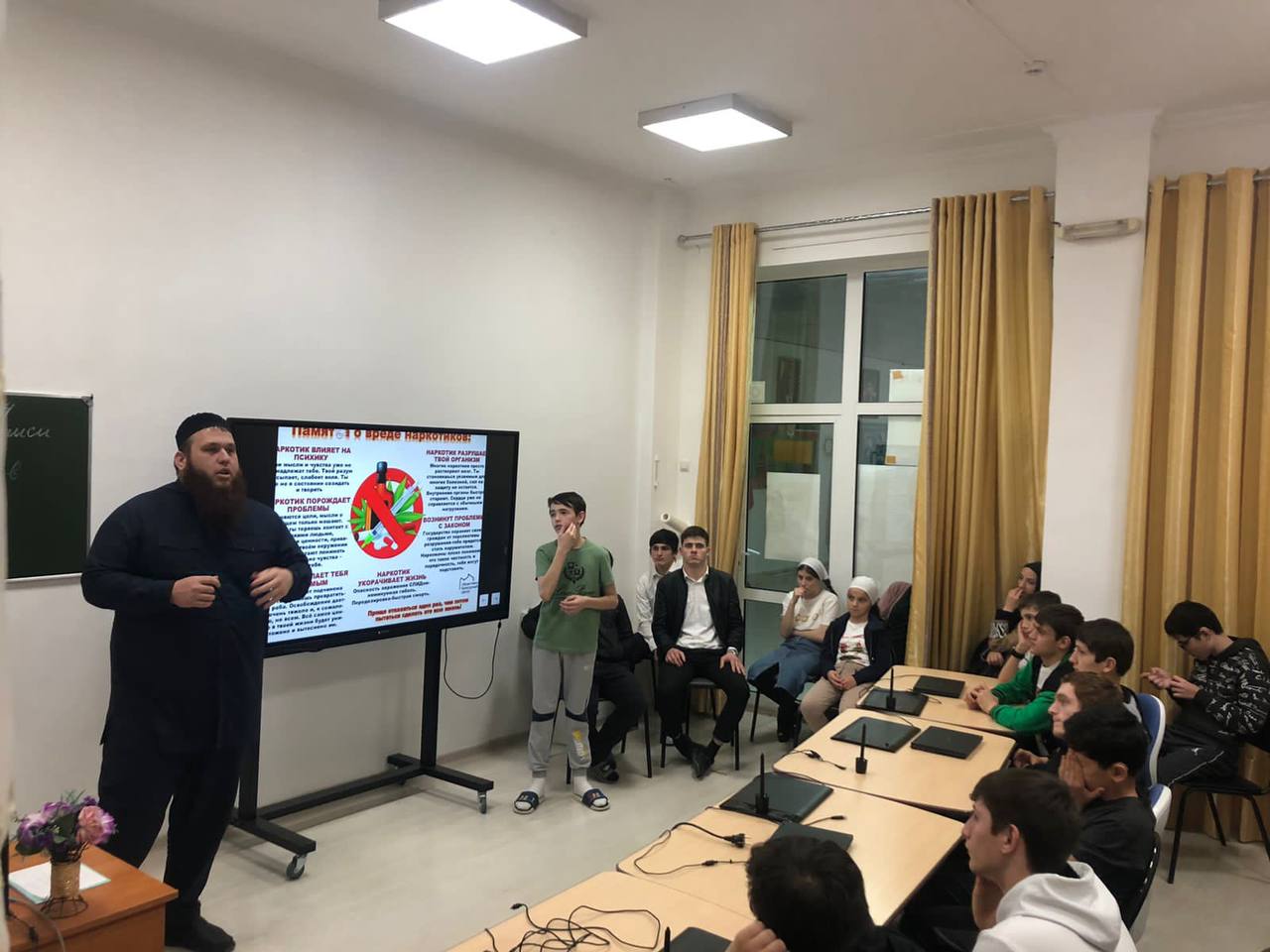 12.04.2023В целях формирования у обучающихся стойкого психологического иммунитета к наркотикам и психотропным веществам, 12 апреля 2023 года педагог по духовно-нравственному воспитанию Исаев И.В.-Х. провёл с обучающимися 7-11 классов беседу «Ислам против наркотиков».