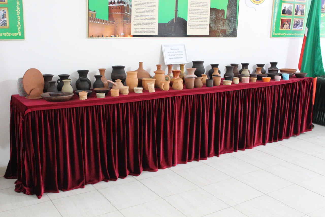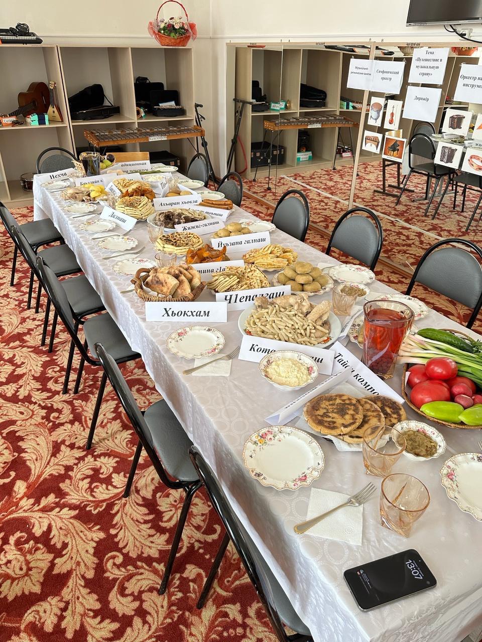 К обеду в кабинете музыкально-ритмических занятий гостей и педагогов ожидал празднично оформленный стол-выставка «Традиционная пища чеченцев» с большим разнообразием национальных блюд. Также в фойе школы была оформлена выставка изделий из глины «Посуда чеченцев прошлых веков».
