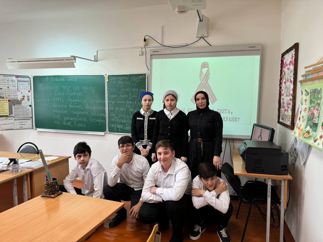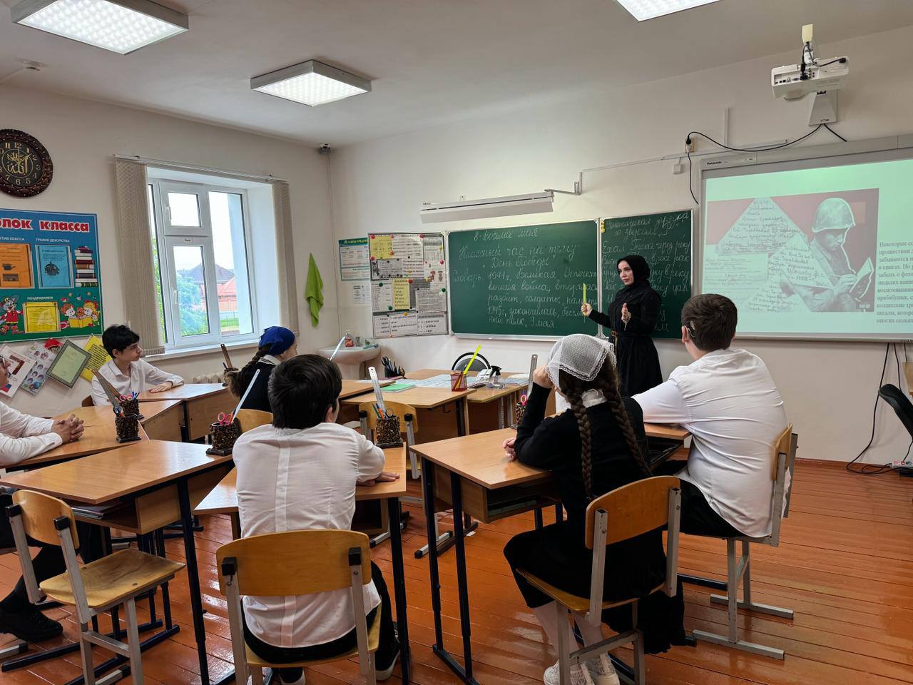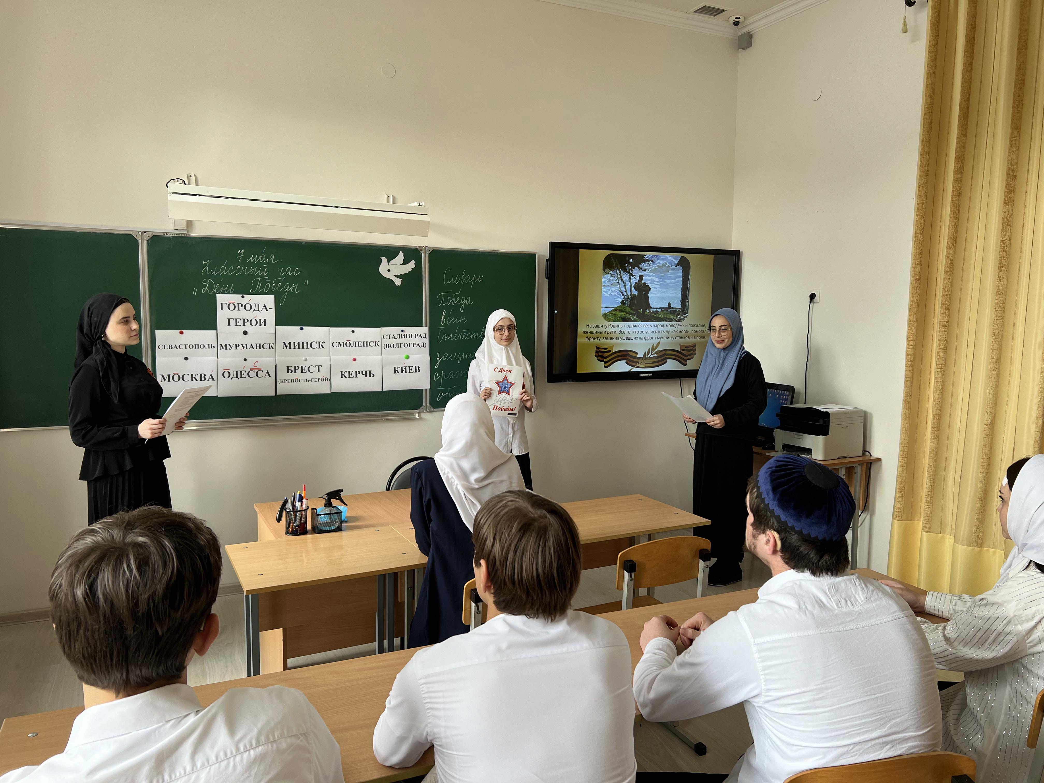 Во всех классах прошли тематические классные часы. Дети читали стихи, пели песни военных лет. Педагоги познакомили школьников с символами Победы (орден Победы, георгиевская лента, Вечный огонь).