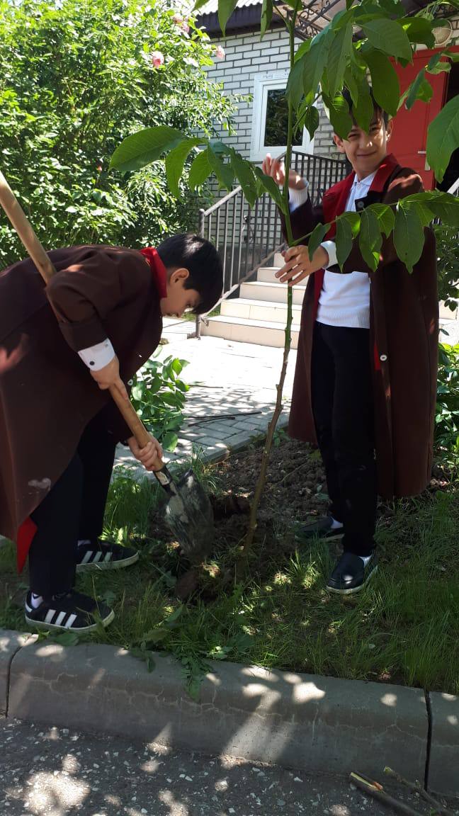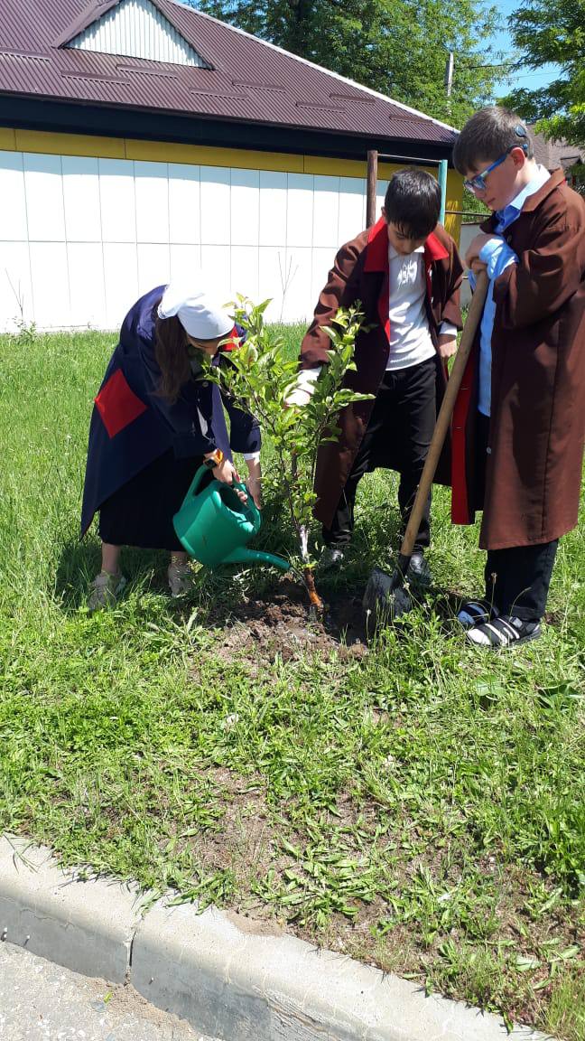 На пришкольной территории в майские дни ребята посадили саженцы фруктовых деревьев (яблоня, вишня, грецкий орех), которые послужат напоминанием о погибших воинах, защищавших нашу страну во время Великой Отечественной войны. Деревья всегда считались символом продолжения жизни на Земле.