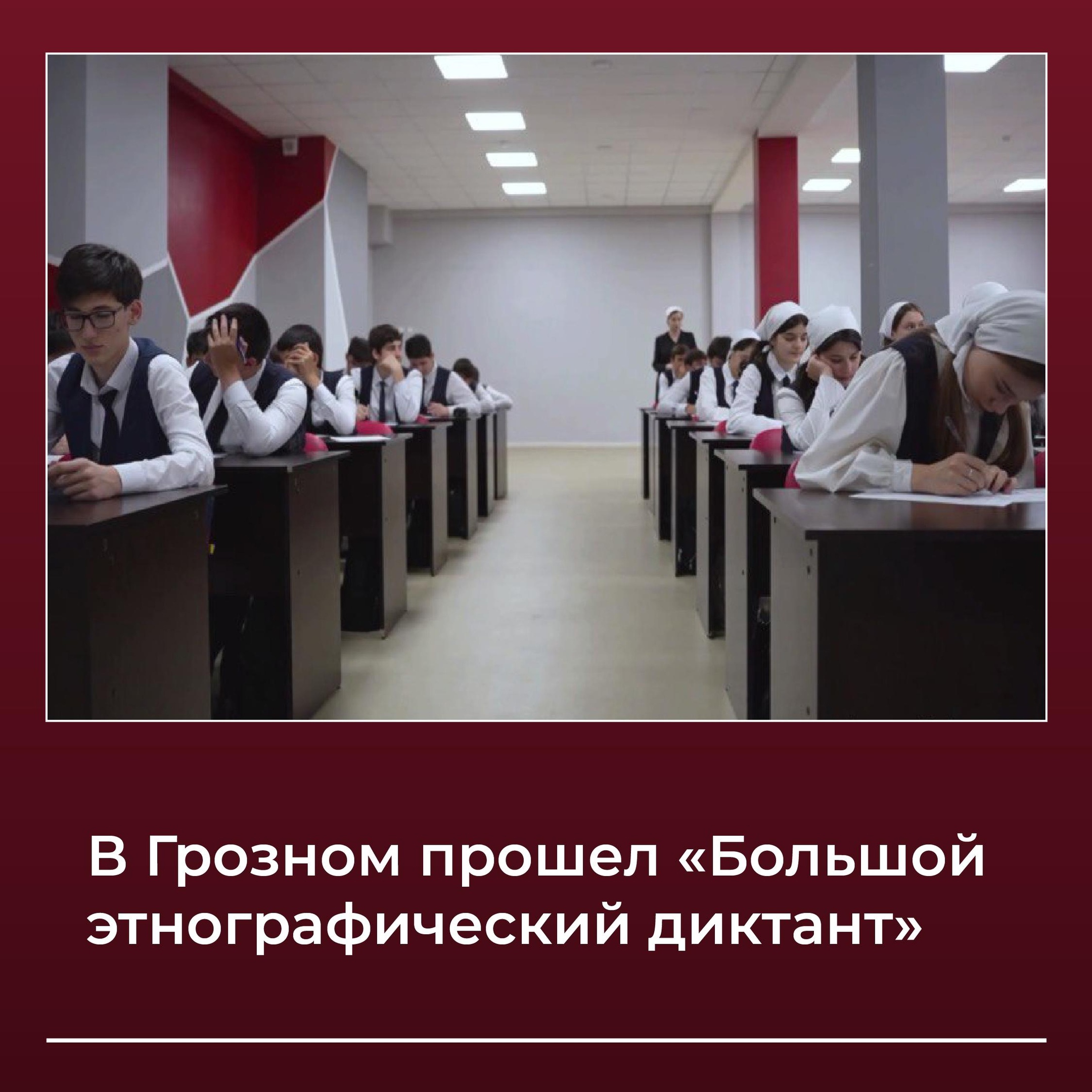4 ноября на базе Гимназии № 5 г. Грозного диктант написали 80 человек. Участники ответили на 30 вопросов: 20 - общих для всех, и 10 - уникальных для каждого субъекта России. Вопросы для зарубежных участников касались мест, связанных с Россией, за её пределами. Участники младше 16 лет отвечали только на 20 общероссийских вопросов.
