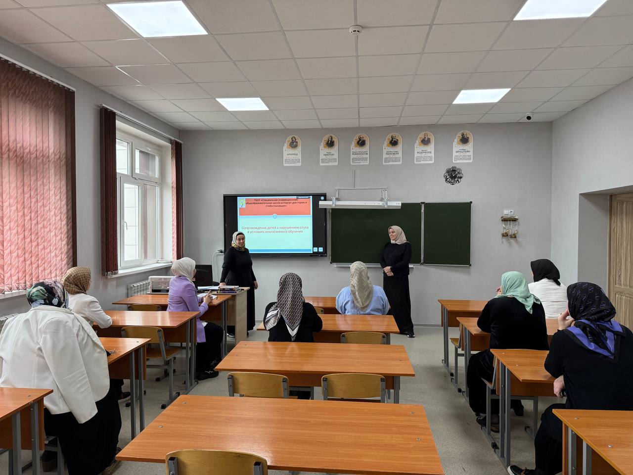 На семинаре выступили замдиректора по коррекционной работе (сурдопедагог) Саламова З. А. и учитель-дефектолог Хучаева М. С. Они рассказали об организации и обучении неслышащих детей. Тема семинара: «Сопровождение детей с нарушением слуха в условиях инклюзивного обучения».