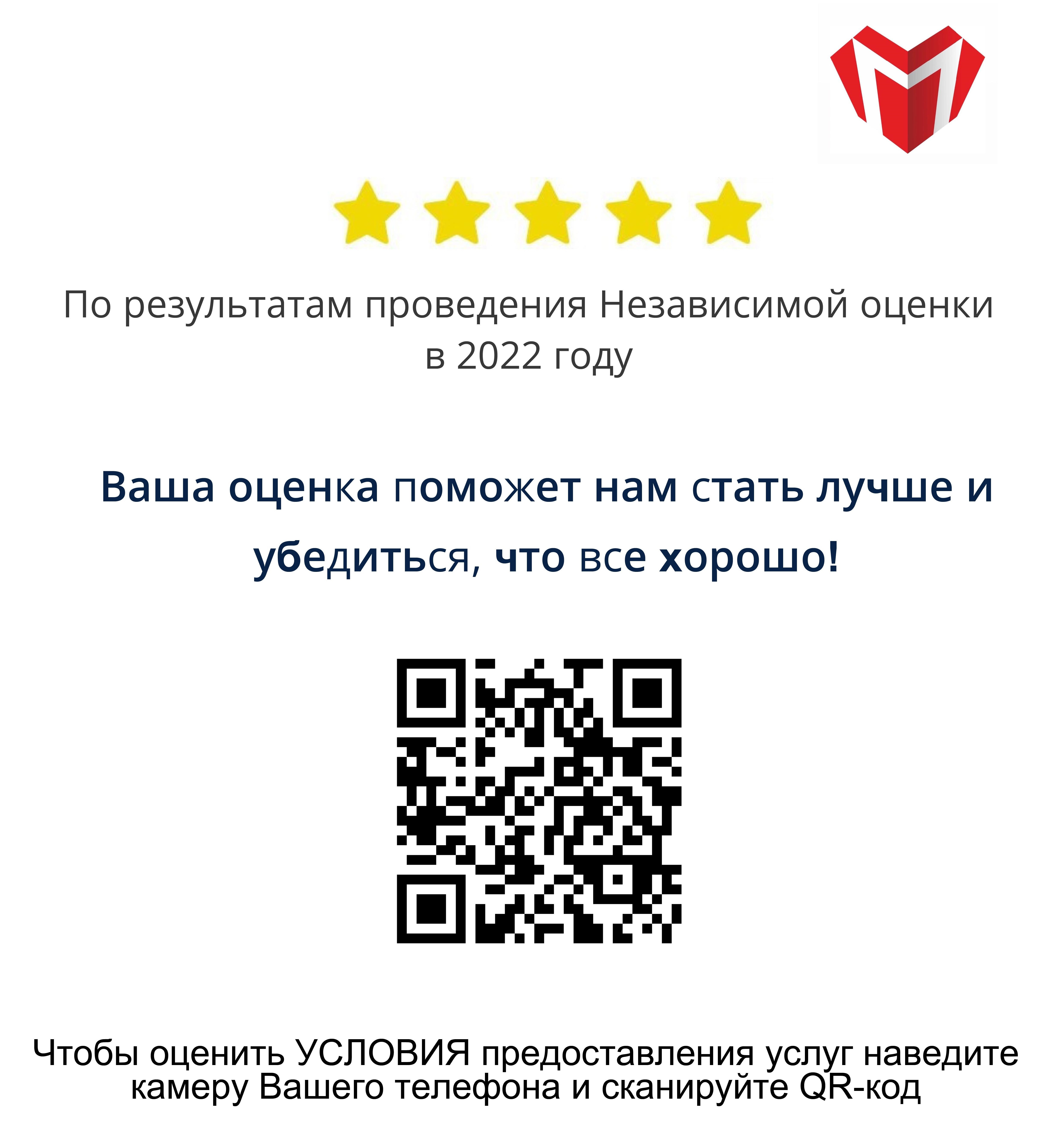 В рамках НОК мы размещаем QR-код, который даёт возможность открыть страницу нашей организации на официальном сайте www.bus.gov.ru или в мобильном приложении «Наше мнение». С помощью QR-кода вы сможете:оценить качество условий оказания услуг в нашей школе; оставить отзыв;оставить обращение и получить на него ответ; ознакомиться с планом по устранению недостатков по результатам проведённой оценки;*ознакомиться с текущим рейтингом нашей школы и оставить отметку о согласии или несогласии с ним.