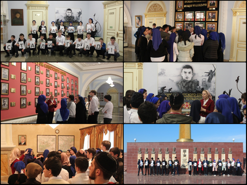 В эти дни, когда вся страна отмечает 75-летие победы в Сталинградской битве, обучающиеся школы-интерната вместе с сотрудниками музея провели флэшмоб «Спасибо, Сталинград!» у барельефов «Герои Советского Союза» и «Сталинградская битва», у музейного уголка, посвященного герою Советского Союза, участнику Сталинградской битвы, легендарному Ханпаше Нурадилову. В завершении мероприятия для обучающихся и педагогов лектором-экскурсоводом Х.И. Муцаевой была проведена комплексная экскурсия по залам Музея имени Ахмат-Хаджи Кадырова.