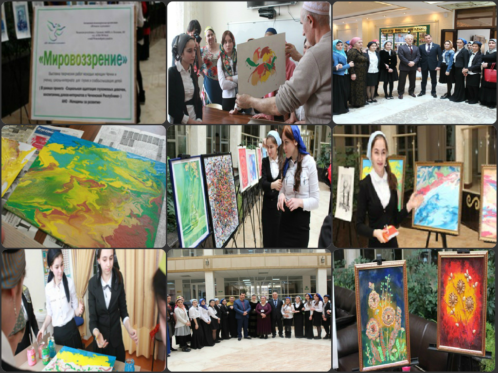В целях оказания помощи в социальном становлении выпускниц школы- интерната, подготовки их к решению сложных социальных и психологических проблем Автономная Некоммерческая организация «Женщины за развитие» в рамках проекта «Социальная адаптация глухонемых девочек – воспитанниц школы- интерната в Чеченской Республике» 5-го марта и 10-го марта 2015 года организовала передвижную благотворительную выставку работ воспитанниц школы- интерната в холлах Национальной библиотеки ЧР и Министерства экономического и территориального развития и торговли ЧР. С учётом потребностей обучающихся с ОВЗ на базе нашей школы проводятся психологические тренинги, специальные компьютерные занятия, проведено три занятия по арт-терапии с привлечением профессионального художника Ильясова А.А. Особый интерес девушек вызвали мастер – классы по темам: «Матрица чувств», «Техника «Эбру», «Графические приёмы работы тушью». Благодаря этим занятиям обучающиеся узнали, чем отличается графика от живописи, научились работать с основными изобразительными искусствами графики: линией, штрихами, тоном. Техника же «Эбру» для воспитанниц явилась прекрасным инструментом развития воображения, моторики и творческого начала.Эбру- древняя восточная живопись, окутанная тайной и секретом рисования на воде. Наших детей этот вид рисования привлек тем, что он является искусством для каждого, то есть любой новичок может легко превзойти мастера. Главное - иметь желание и уметь получать удовольствие от процесса. Это подтвердили наши воспитанницы, создавшие уникальные картины, вдохновляющие на новые творческие свершения.Итогом этой работы и стала выставка рисунков, на которой работы обучающихся нашей школы увидели представители органов Государственной власти Чеченской Республики, общественности, дети, их родители, преподаватели.Выставка также включала в себя экспозицию работ молодых, подающих надежды художниц Чеченской Республики. Выражаем благодарность АНО «Женщины за развитие», администрации Национальной библиотеки Чеченской Республики, Министерству экономики, территориального развития и торговли ЧР, Министерству по национальной политике, внешним связям, печати и информации ЧР, заслуженному художнику А.А Ильясову за оказанную помощь и поддержку, подаренную нашим воспитанницам возможность прикоснуться к миру искусства.